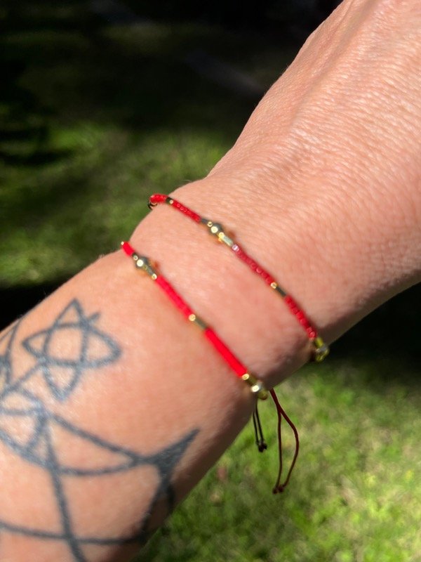 Pulsera regulable de hilo con cuentas japonesas y detalle de piezas bañadas en oro 18k. Los colores se pueden personalizar a tu gusto!